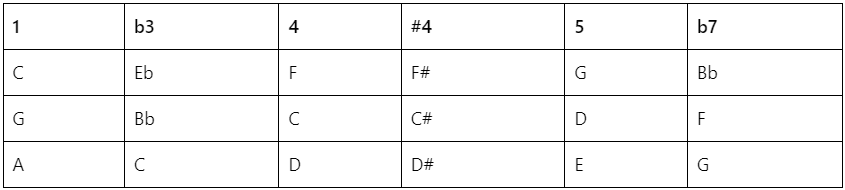 The flavor of stride music is deeply rooted in the sound of a blues scale. Make sure you are familiar with the scale and practice improvising in time on this scale with your right hand. Turn on your metronome, perhaps to 80bpm. In your left hand, you can just play single bass notes on beats one and three – in the right hand, explore some improvised melodies using the blues scale. Here is the formula of the blues scale, with an example of the notes in a few different keys: